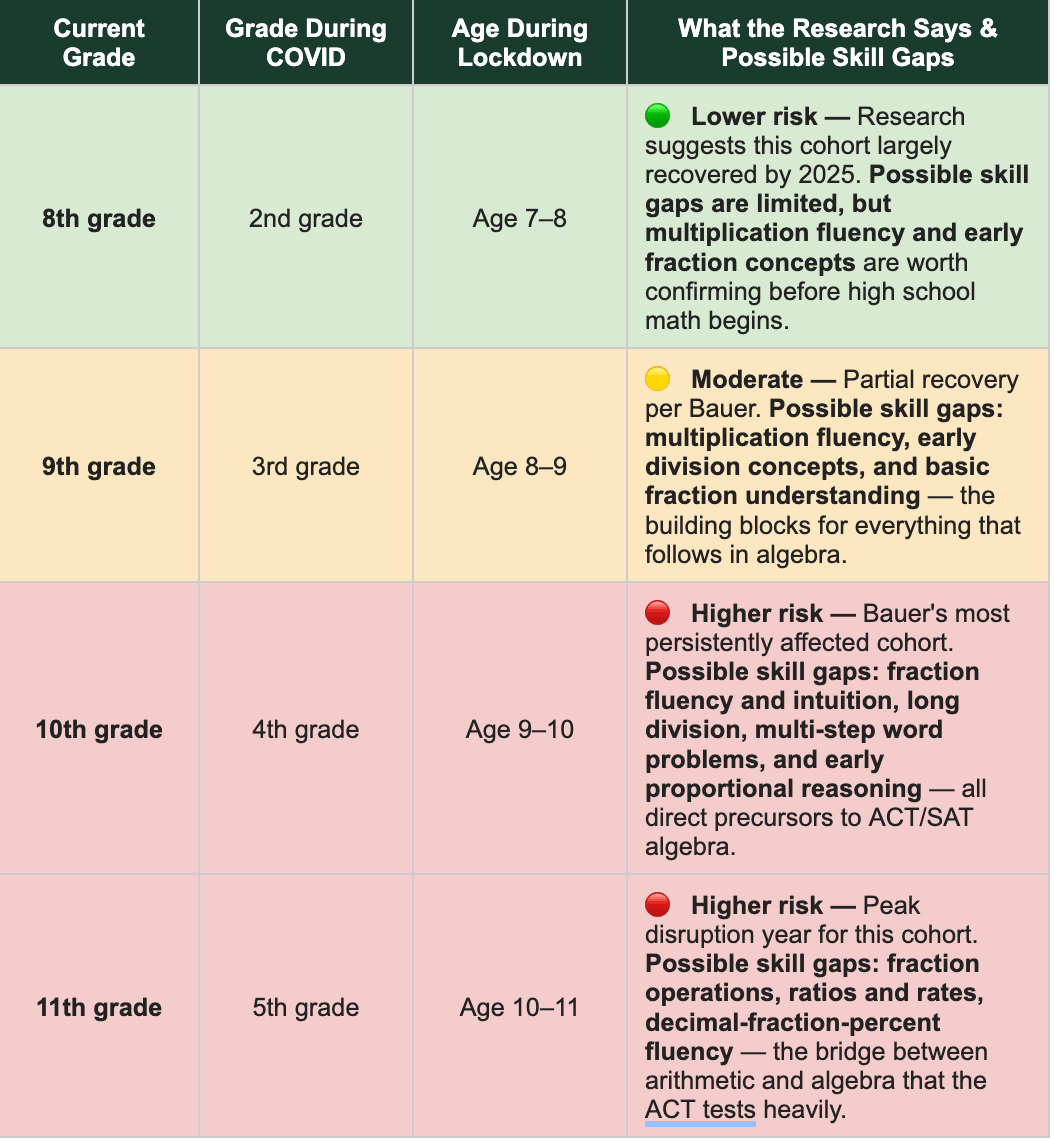 Maya isn’t struggling because she’s bad at math. She’s struggling because she has a gap that her grades never revealed. And that gap — as Vickie and I have come to understand it — has a very specific origin. Maya was in 4th grade during COVID.